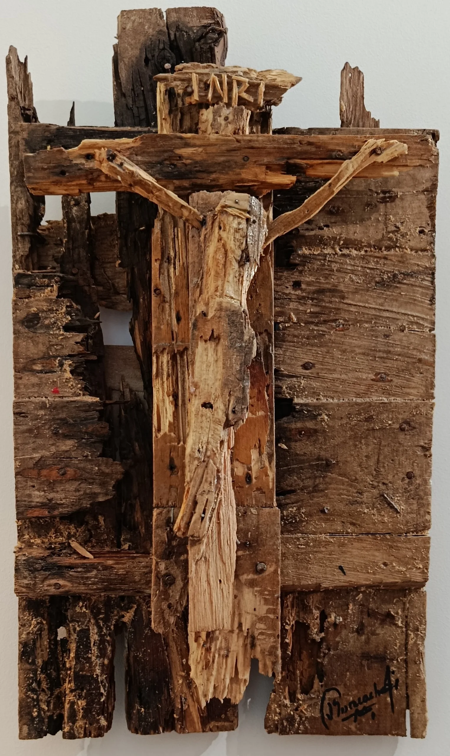 La obra es realizada en honor a nuestro salvador Jesucristo con trozos de madera encontrada