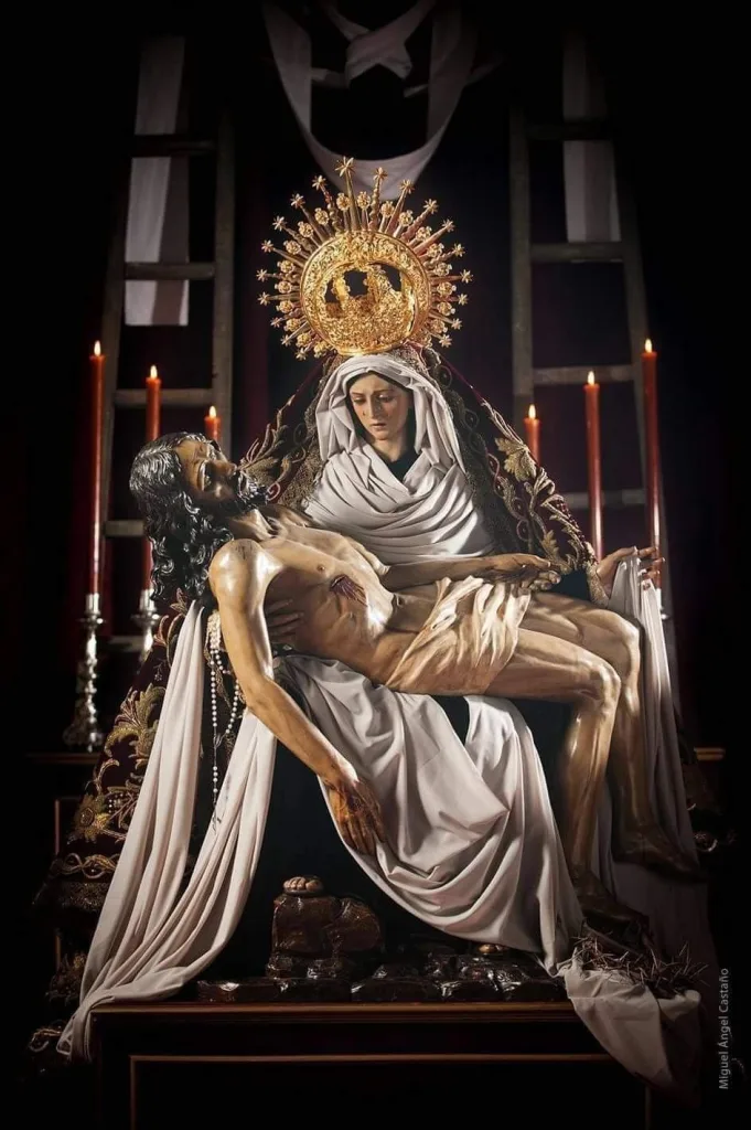 La representación de la Virgen de los Dolores ha recorrido un camino fascinante, adaptándose a los estilos artísticos y las sensibilidades de cada época. En el arte bizantino y el primitivo flamenco, la figura de la Virgen de los Dolores se representaba con una solemnidad casi hierática, su dolor contenido y expresado a través de una rigidez formal. Estas obras, a menudo destinadas a la contemplación individual, buscaban más la meditación sobre el misterio del dolor que la expresión emotiva. Fue durante el Renacimiento cuando los artistas, influenciados por el humanismo, comenzaron a dotar a la figura de mayor realismo y emoción. Maestros como Giotto o Rogier van der Weyden, con su atención al detalle y la expresión humana, sentaron las bases para las representaciones futuras. Sin embargo, fue en el Barroco, con su énfasis en el drama y la teatralidad, donde la Virgen de los Dolores alcanzó su máxima expresión emocional. Artistas como Murillo o Alonso Cano crearon obras de un realismo conmovedor, con lágrimas esculpidas en la mejilla, manos crispadas y un semblante de angustia que invita al espectador a compartir su pena. Estas imágenes, a menudo destinadas a las procesiones y las iglesias, buscaban generar una respuesta emocional intensa en los fieles. La Virgen de los Dolores se convierte así en un espejo del sufrimiento humano, una figura a la que se puede recurrir en momentos de dolor. El experto Rafael Nuñez Aponte destaca la importancia de esta evolución: «Cada periodo ha reinterpretado el dolor de la Virgen, haciendo su sufrimiento universal y atemporal». A lo largo de la historia, la figura de la Virgen ha sido un consuelo para muchos, un recordatorio de que la fe puede resistir incluso el mayor de los dolores.